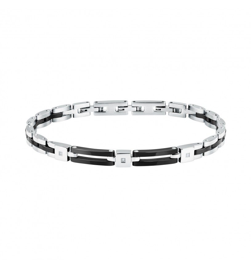 Braccialetto da uomo realizzato in acciaio anallergico rodiato con ceramica nera. Inserti con zirconi bianchi.
