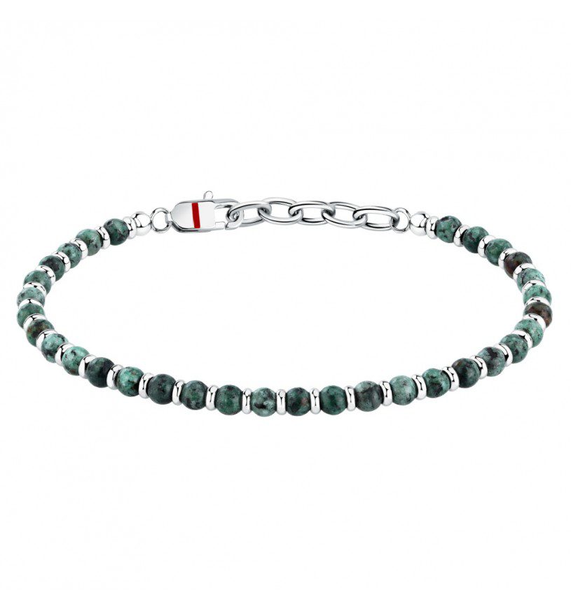 Braccialetto da uomo realizzato in acciaio anallergico con finitura lucida e sfere in agata verde.