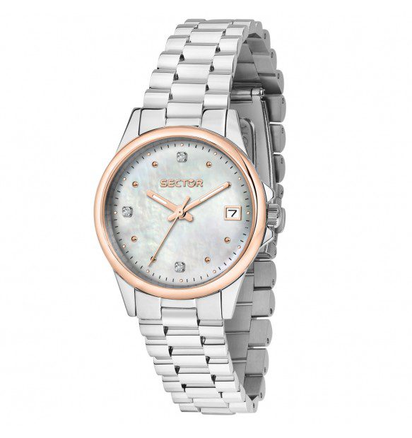 Quadrante analogico in madreperla con indici a bastoni rose gold e datario a ore 3.