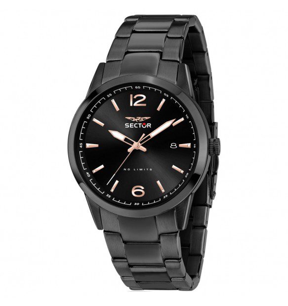Quadrante nero con indici a bastoni color oro rosa, logo nella parte alta e datario a ore 3.